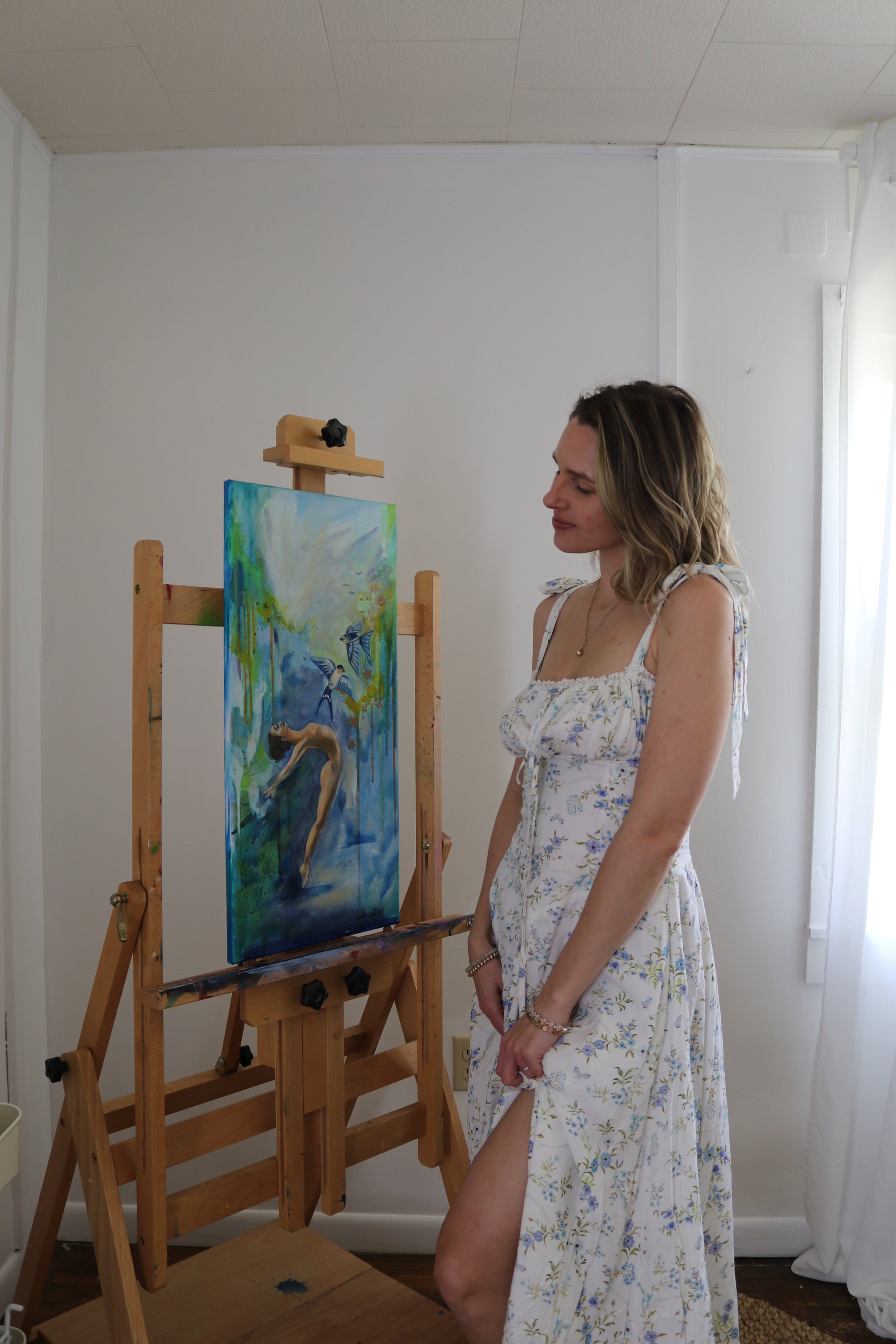“In Him I Dwell” is inspired by Acts 17:28: "In Him I live, and move, and have my being." This expressive Christian artwork captures a woman in a moment of total surrender—back arched, chest lifted toward the heavens, and arms released in a posture of worship and freedom. Above her, two sparrows soar—symbols of God’s intimate care and provision and the lightness that comes when we allow the Holy Spirit to dwell within us.