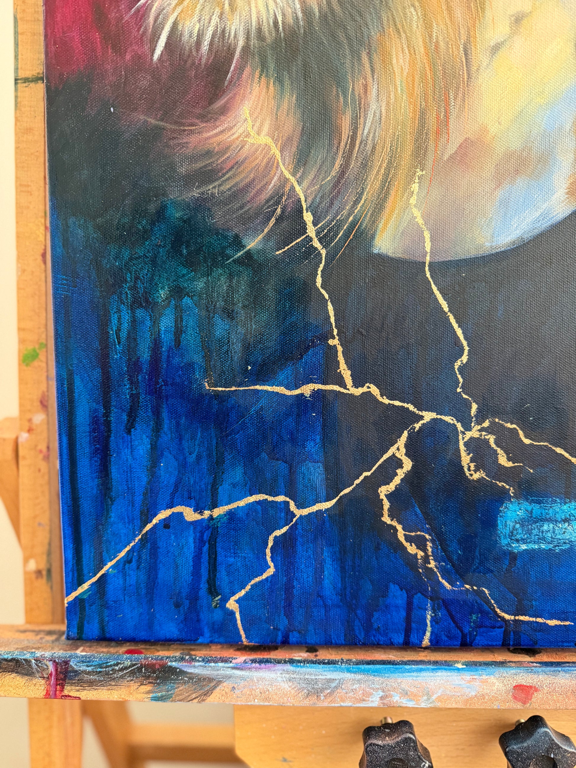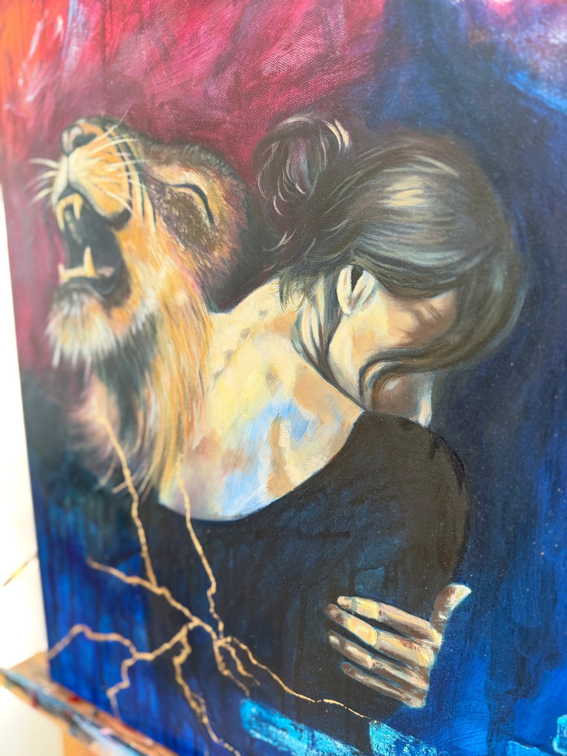 The lion represents that untamed emotion, fierce and raw. The woman turned inward, reflects the tension between shutting down and opening up. And the gold cracks? They're where God begins to move- not after the anger is gone, but right in the middle of it.