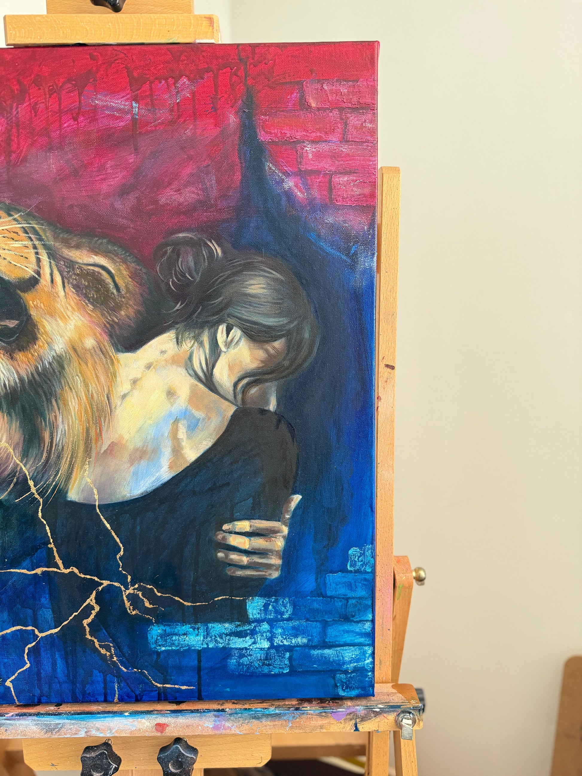 This piece is a powerful visual narrative about the anger we try to hide- the kind that builds walls and keeps others out. This painting captures the moment we choose honesty over silence, when the roar inside finally breaks through.